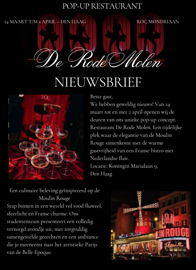 Vanaf 24 maart is het het vierde HOP-restaurant in de serie van zes gestart: De Rode Molen. Bezoek zelf eens een keer zo’n HOP-experience, door een tafeltje te boeken. Hoe leuk is het om eens te dineren in de Victory Boogie Woogie; de studenten kijken met plezier naar u uit. Reserveren kan via
