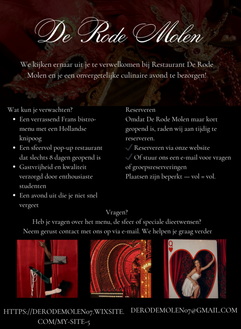 Let op: reserveren kan alleen via derodemolen07@gmail.com